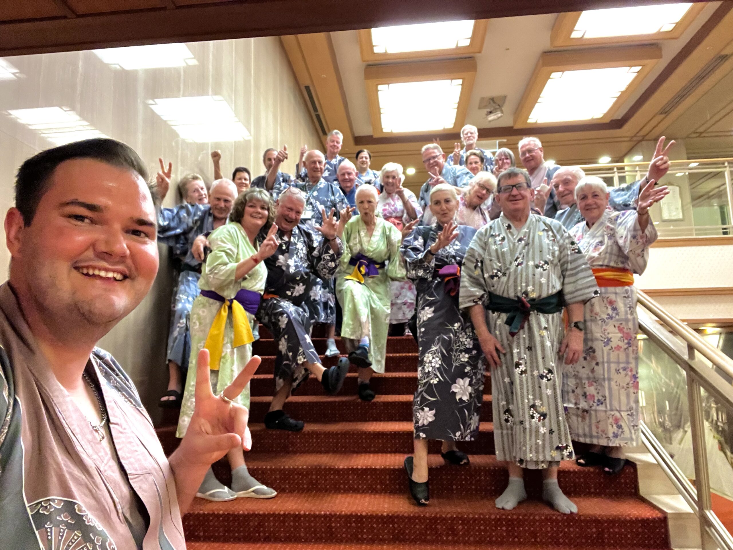 The bittersweet final day. After breakfast, I handed out little Japanese snack packs for the journey home and helped everyone with their departures. We sang happy birthday to Justin before he left. Barb and Ralph jumped on the bullet train back to Tokyo — and even met up with Dan and Michelle at the Qantas Lounge later that day!